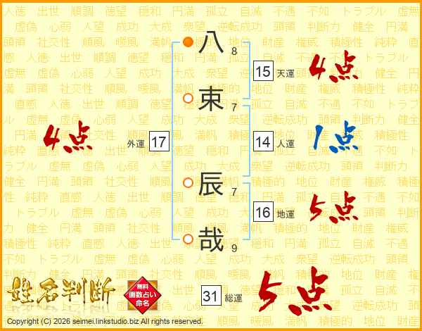生活面を象徴する運勢です。外部から受ける影響力を表し、結婚運、家庭運や職場、環境への順応性を表します。総運から人運を引いた画数。姓や名が1文字の場合を除く。