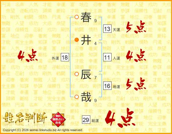 あなたの人生を表す1番重要な運勢です。生涯を通じて影響する総合運となり、主に50歳以降の晩年期に影響を及ぼします。苗字と名前の合計画数。