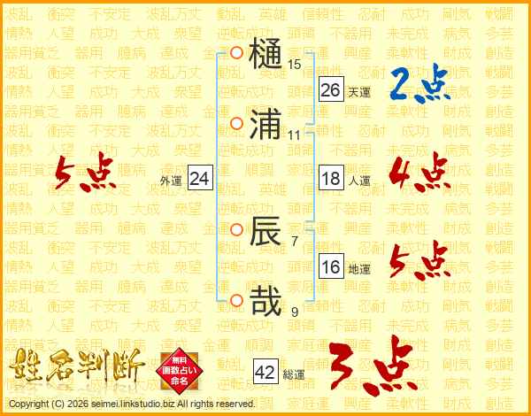 樋(15画)浦(11画) 辰(7画)哉(9画)