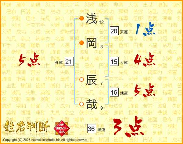 浅(12画)岡(8画) 辰(7画)哉(9画)