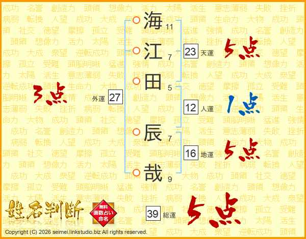 海(11画)江(7画)田(5画) 辰(7画)哉(9画)
