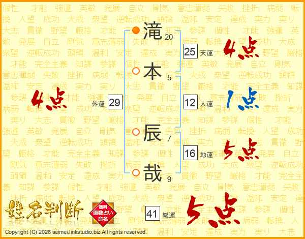 滝(20画)本(5画) 辰(7画)哉(9画)