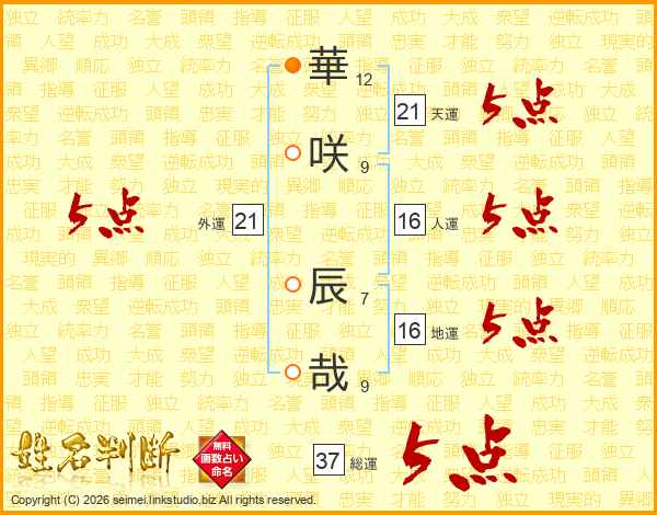 華(12画)咲(9画) 辰(7画)哉(9画)