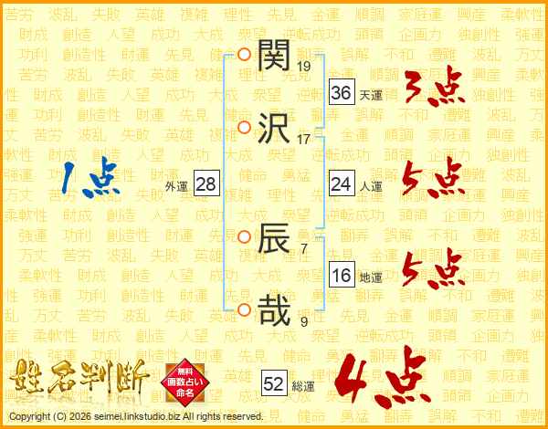関(19画)沢(17画) 辰(7画)哉(9画)