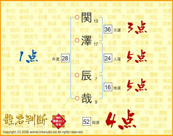 関澤辰哉さんの総運は52画の4点!