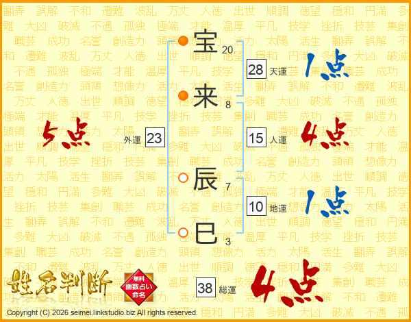 宝来辰巳さんの総運は38画の4点!