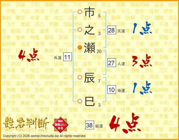 市(5画)之(3画)瀬(20画) 辰(7画)巳(3画)