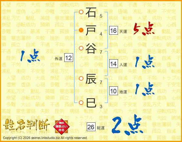 石(5画)戸(4画)谷(7画) 辰(7画)巳(3画)