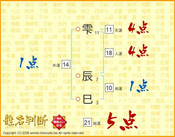 生活面を象徴する運勢です。外部から受ける影響力を表し、結婚運、家庭運や職場、環境への順応性を表します。総運から人運を引いた画数。姓や名が1文字の場合を除く。
