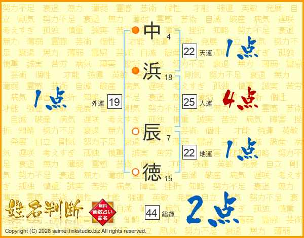 中(4画)浜(18画) 辰(7画)徳(15画)