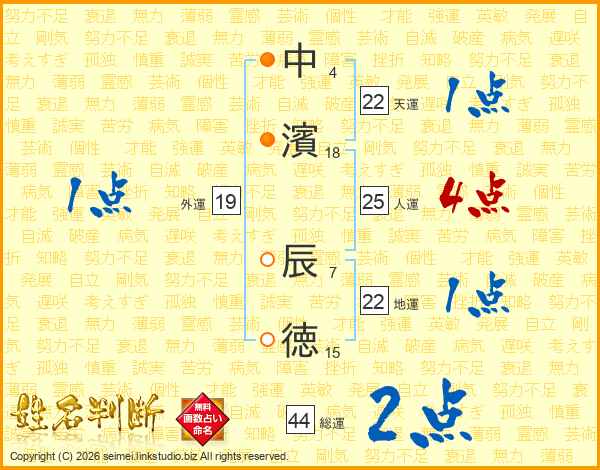 中(4画)濱(18画) 辰(7画)徳(15画)