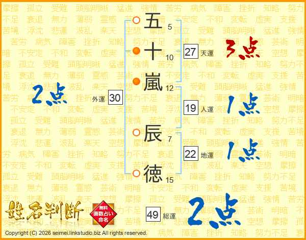 五(5画)十(10画)嵐(12画) 辰(7画)徳(15画)