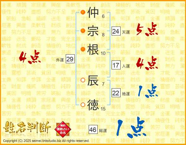 仲(6画)宗(8画)根(10画) 辰(7画)徳(15画)