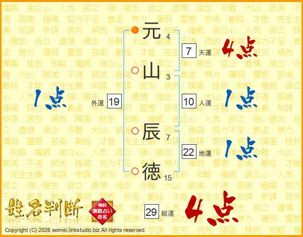 元(4画)山(3画) 辰(7画)徳(15画)