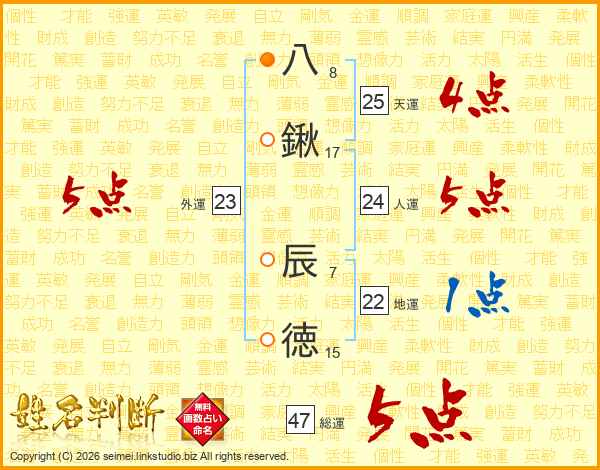 八(8画)鍬(17画) 辰(7画)徳(15画)
