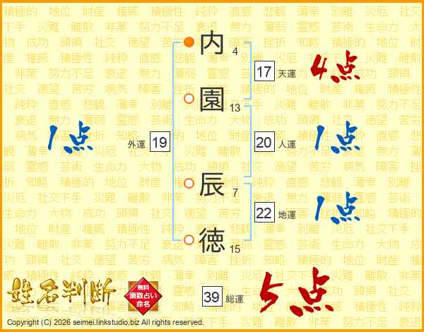 生活面を象徴する運勢です。外部から受ける影響力を表し、結婚運、家庭運や職場、環境への順応性を表します。総運から人運を引いた画数。姓や名が1文字の場合を除く。