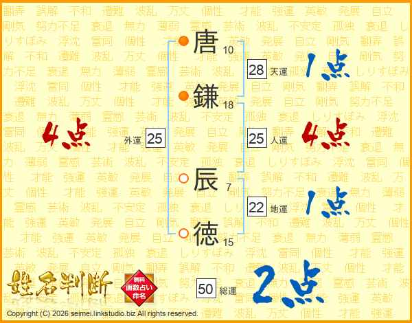 唐(10画)鎌(18画) 辰(7画)徳(15画)