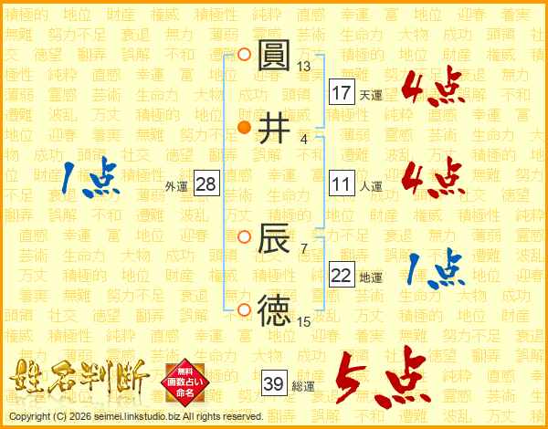 圓(13画)井(4画) 辰(7画)徳(15画)