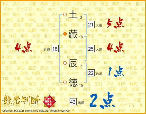 土(3画)藏(18画) 辰(7画)徳(15画)