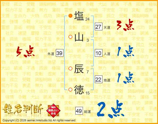 塩(24画)山(3画) 辰(7画)徳(15画)