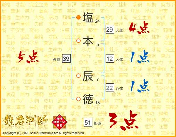 塩(24画)本(5画) 辰(7画)徳(15画)