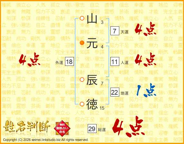 山(3画)元(4画) 辰(7画)徳(15画)