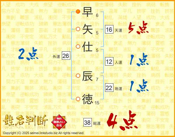 早(6画)矢(5画)仕(5画) 辰(7画)徳(15画)