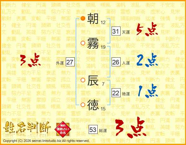 朝(12画)霧(19画) 辰(7画)徳(15画)