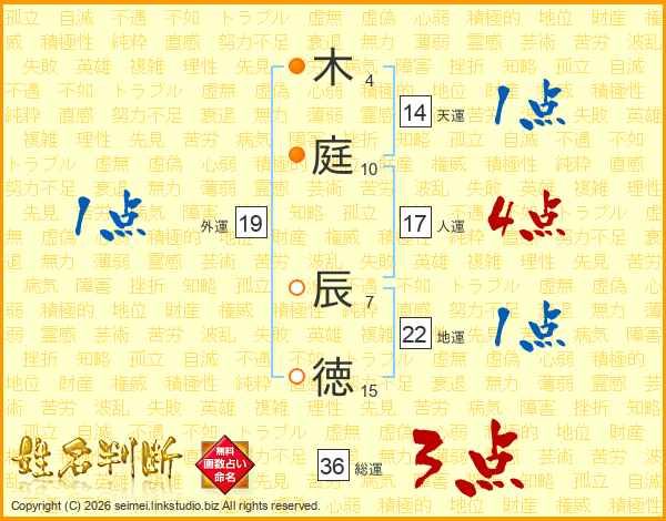 木(4画)庭(10画) 辰(7画)徳(15画)