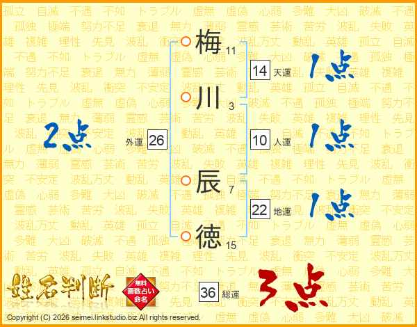 梅(11画)川(3画) 辰(7画)徳(15画)