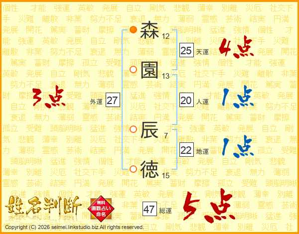 生活面を象徴する運勢です。外部から受ける影響力を表し、結婚運、家庭運や職場、環境への順応性を表します。総運から人運を引いた画数。姓や名が1文字の場合を除く。