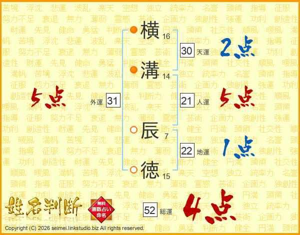 横溝辰徳さんの総運は52画の4点!