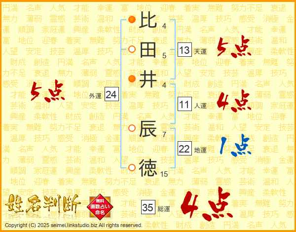 比(4画)田(5画)井(4画) 辰(7画)徳(15画)