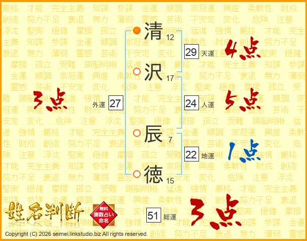 清沢辰徳さんの総運は51画の3点!