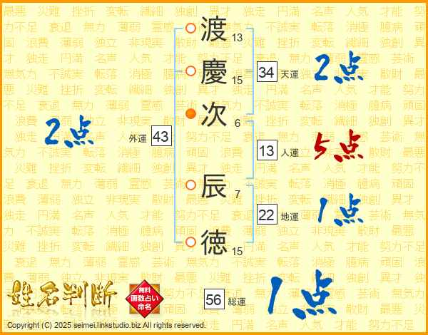 渡(13画)慶(15画)次(6画) 辰(7画)徳(15画)