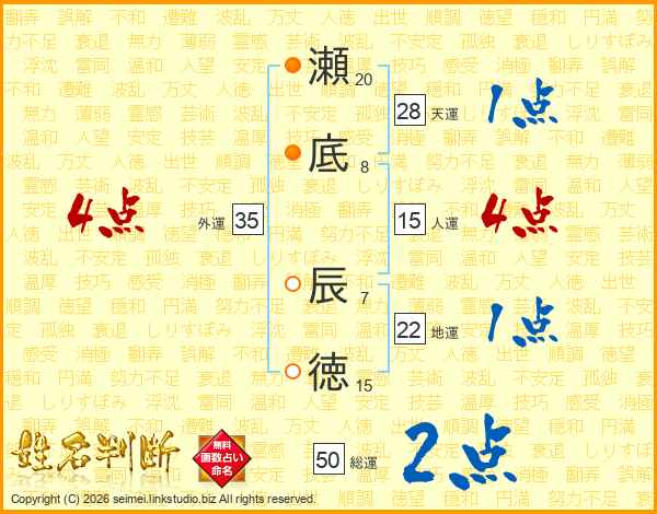 瀬(20画)底(8画) 辰(7画)徳(15画)
