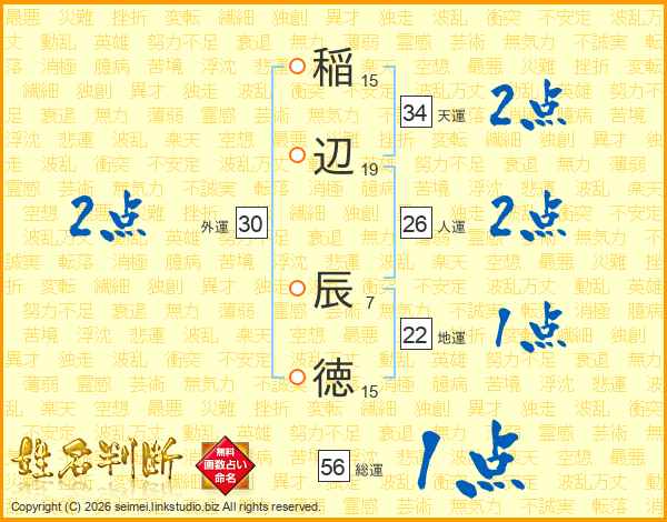 稲(15画)辺(19画) 辰(7画)徳(15画)