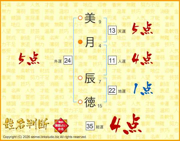 生活面を象徴する運勢です。外部から受ける影響力を表し、結婚運、家庭運や職場、環境への順応性を表します。総運から人運を引いた画数。姓や名が1文字の場合を除く。