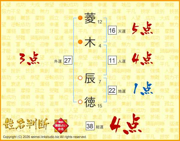 菱(12画)木(4画) 辰(7画)徳(15画)