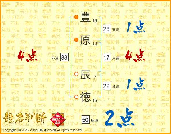 豊(18画)原(10画) 辰(7画)徳(15画)