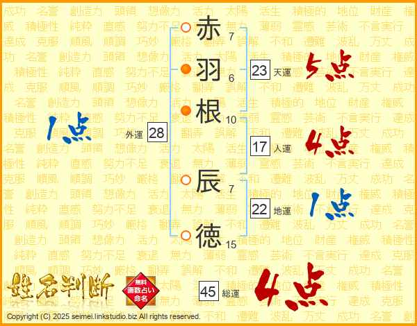 赤(7画)羽(6画)根(10画) 辰(7画)徳(15画)