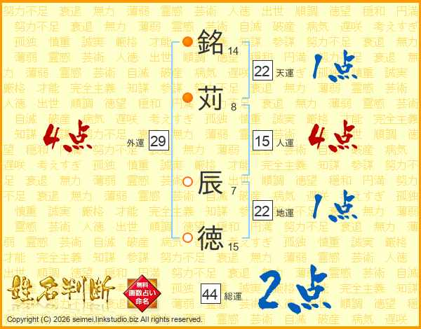 銘苅辰徳さんの総運は44画の2点!