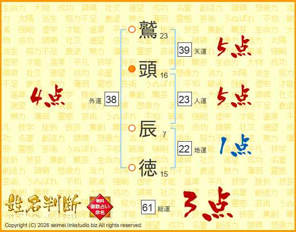 鷲(23画)頭(16画) 辰(7画)徳(15画)