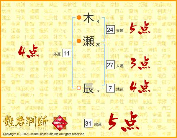 木瀬辰さんの総運は31画の5点!