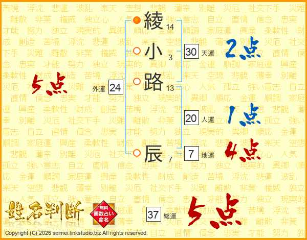 生活面を象徴する運勢です。外部から受ける影響力を表し、結婚運、家庭運や職場、環境への順応性を表します。総運から人運を引いた画数。姓や名が1文字の場合を除く。