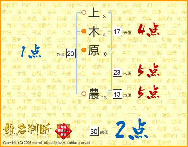生活面を象徴する運勢です。外部から受ける影響力を表し、結婚運、家庭運や職場、環境への順応性を表します。総運から人運を引いた画数。姓や名が1文字の場合を除く。