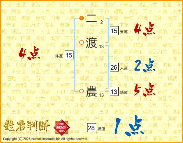 生活面を象徴する運勢です。外部から受ける影響力を表し、結婚運、家庭運や職場、環境への順応性を表します。総運から人運を引いた画数。姓や名が1文字の場合を除く。