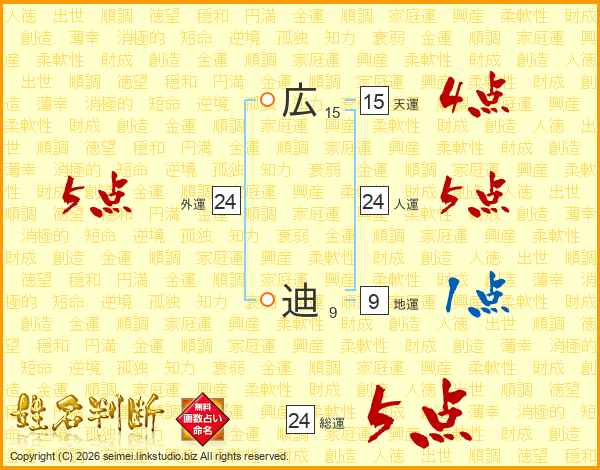 生活面を象徴する運勢です。外部から受ける影響力を表し、結婚運、家庭運や職場、環境への順応性を表します。総運から人運を引いた画数。姓や名が1文字の場合を除く。