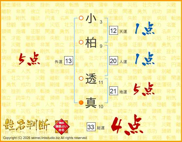 生活面を象徴する運勢です。外部から受ける影響力を表し、結婚運、家庭運や職場、環境への順応性を表します。総運から人運を引いた画数。姓や名が1文字の場合を除く。