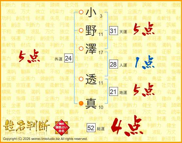 小野澤透真さんの総運は52画の4点!